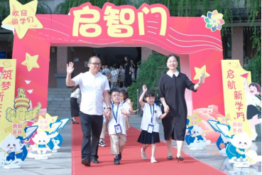一年级新生在校长和老师的带领下穿过“启智门”进入操场