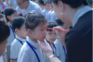 作为典礼的重要环节,一年级新生“开笔礼”仪式有序开展:新生们在老师指引下“端正衣冠”,以整洁姿态开启求学之路;随后行“拜师礼”,依次向孔圣、先贤与师长行礼;老师们为新生眉心点上朱砂,寓意“启智明心”;最后,全体师生共同“击鼓明志”,“做新时代好少年”的誓言响彻校园,将仪式感与教育意义深度融合。